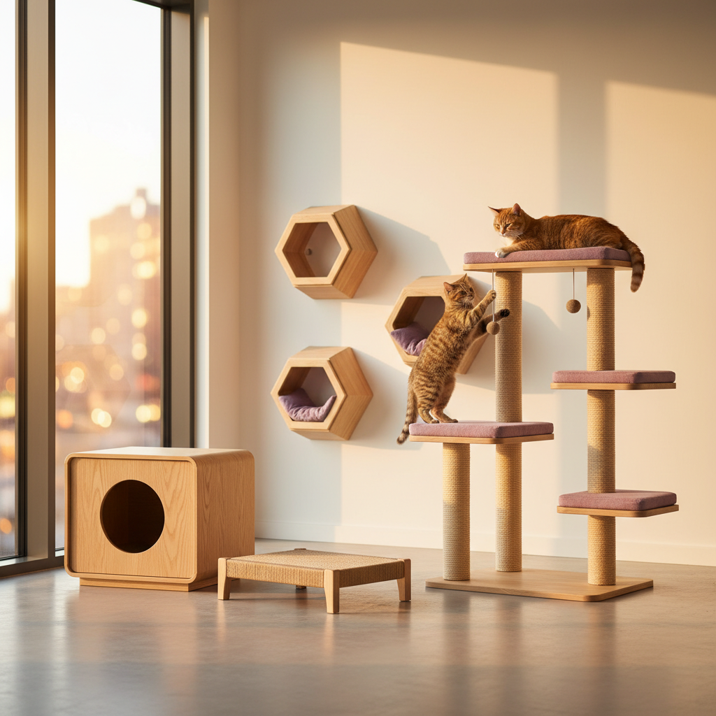Un bife-baño discreto para mis necesidades, rascadores variados y, por supuesto, una buena torre o un sistema de módulos en la pared. ¡Quiero opciones, Karen! ¡Y quiero que sean elegantes y robustas!
